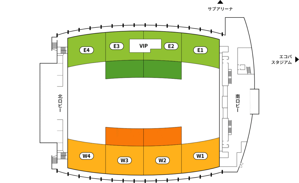 エコパアリーナのキャパは最大10,000人です。そのうち固定席が4,868席(貴賓席・車椅子スペース含)なので、スタンドとアリーナの割合はおよそ半々のようです。